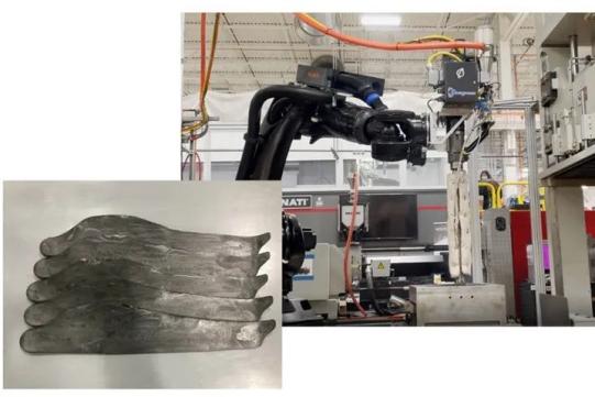 ORNL开发的工艺名为AMCM(增材制造+模压成型),它将一台采用机器人的挤出打印机与随后的模压成型步骤集于一体。