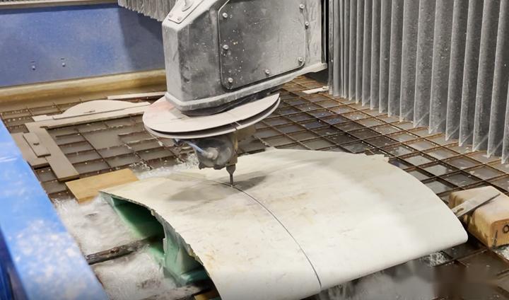 专注于可持续性:ORNL为回收报废部件而开发的解决方案包括用水刀切割风机叶片(图示),粉碎后通过3D打印或其他工艺进行再利用距离MDF 30分钟的车程,美国能源部设立在ORNL的碳纤维技术设施(CFTF)运行着一条全范围的碳纤维生产线,使技术人员们能够试验并优化碳纤维生产的各个方面以及从生产线上下来的碳纤维的性能。一台BAAM打印机和拉挤系统能够立即采用新制成的纤维制造部件。正在开展的研究还包括采用煤制造低成本、高质量的碳纤维,以及在生产过程中采用一种方法来处理碳纤维,使它具有天然的抗雷击性,从而不需要为飞机或风力发电机部件提供额外的雷击保护。