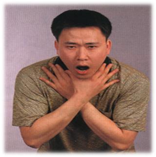 病人常常不由自主的表现为:手呈“V”字状紧贴于颈前,表情痛苦、呛咳、咳嗽、呼吸困难、口唇面色青紫。