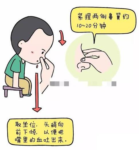 4. 取坐位,不要后仰,避免血液呛入气道, 尽量将从鼻腔咽到口腔的血吐出,这样既可以知道出血量的多少,也可以避免将鼻血咽进胃里,刺激胃部引起呕吐。