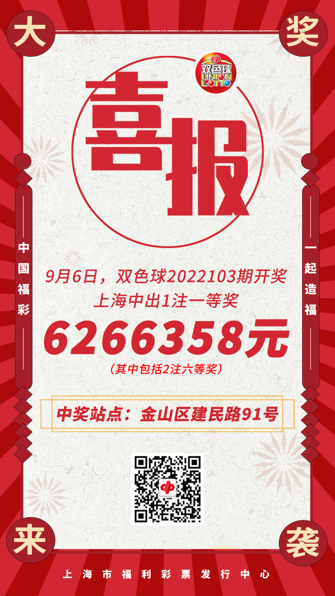 其中上海中得1注一等奖,大奖出自金山区建民路91号,中奖彩票为单式投注,投注金额6元,揽获奖金6266358元(包括2注六等奖)。此外上海地区还中得8注二等奖,单注奖金130104元,彩票售出于新渔东路235号、石泉路226号福彩销售点。