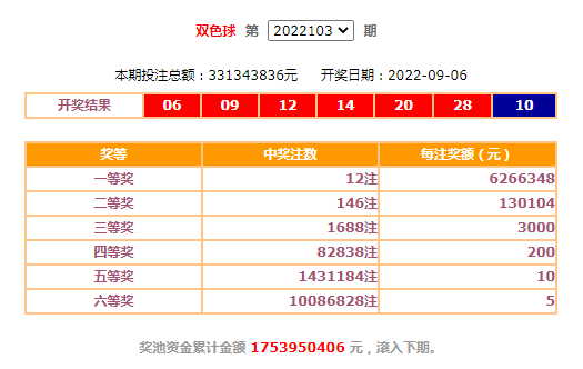 9月6日晚,双色球第2022103期开奖,红球号码为06、09、12、14、20、28,蓝球号码为10。本期全国共开出12注一等奖,单注奖金6266348元。计奖后,双色球奖池累计17.53亿元。