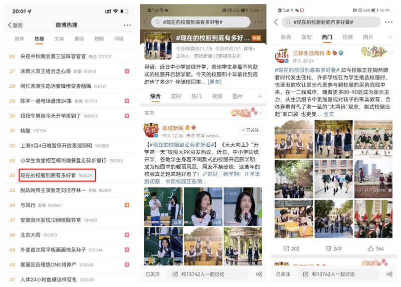 9月4日,微博话题“现在的校服到底有多好看”登上热搜, “三联生活周刊”、“中国服饰”等媒体微博纷纷参与,引发了超1.5万网友热议,阅读量超1.2亿次,不少网友直呼“想回去上学”、“校服越来越美了”。