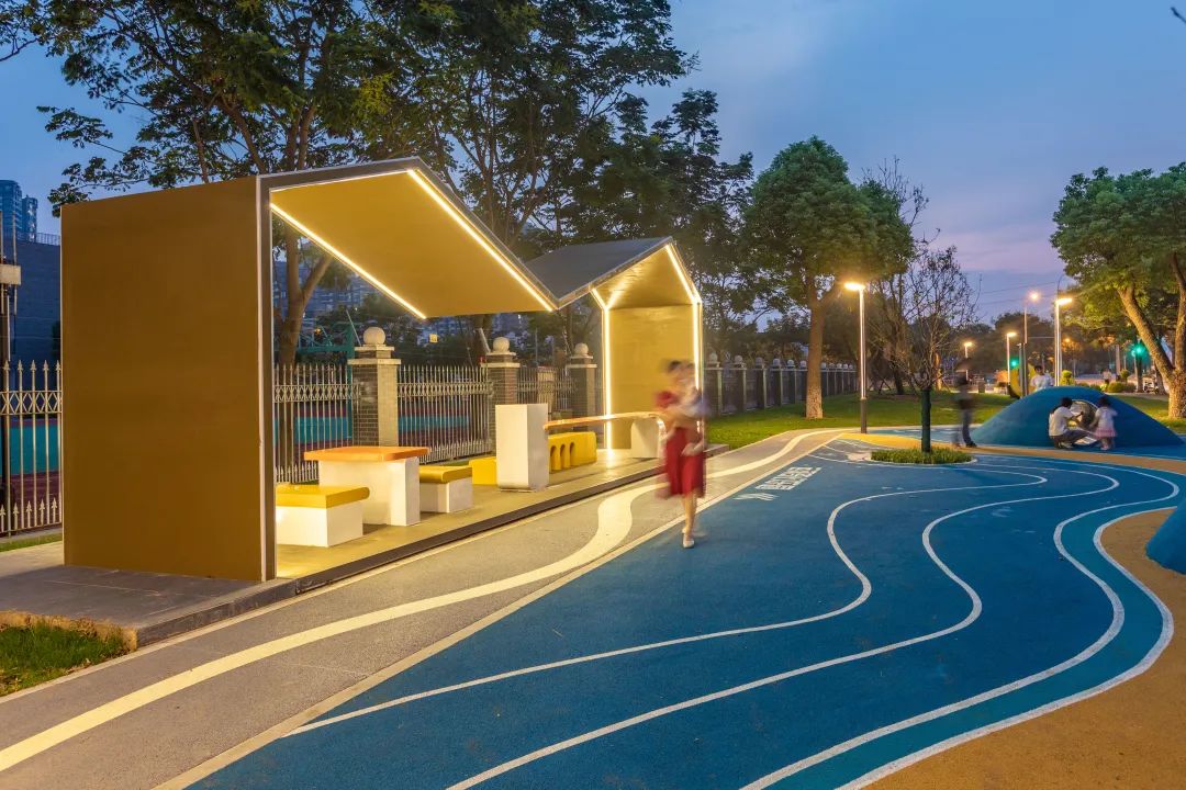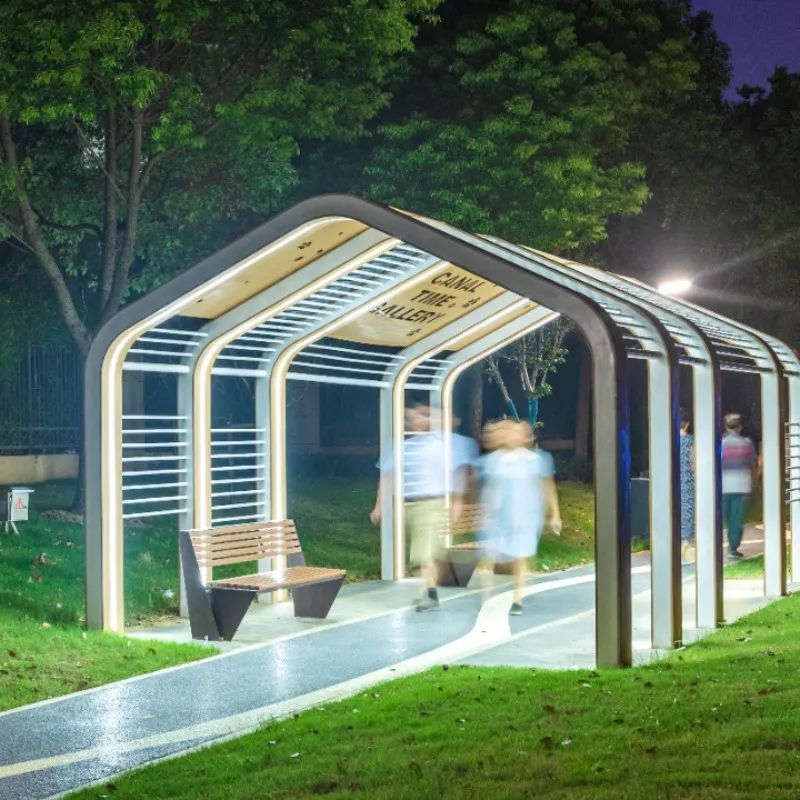 而在新光路口的节点光影水韵则是使用了新颖的科技手段,塑造了星河廊架、轮船奇妙屋等现代构架,以时尚的手法演绎运河文化,并且融入亲子互动、科普宣传和老年人康体功能分区,满足市民对户外健身、休闲娱乐、文化科普的多样化需求。