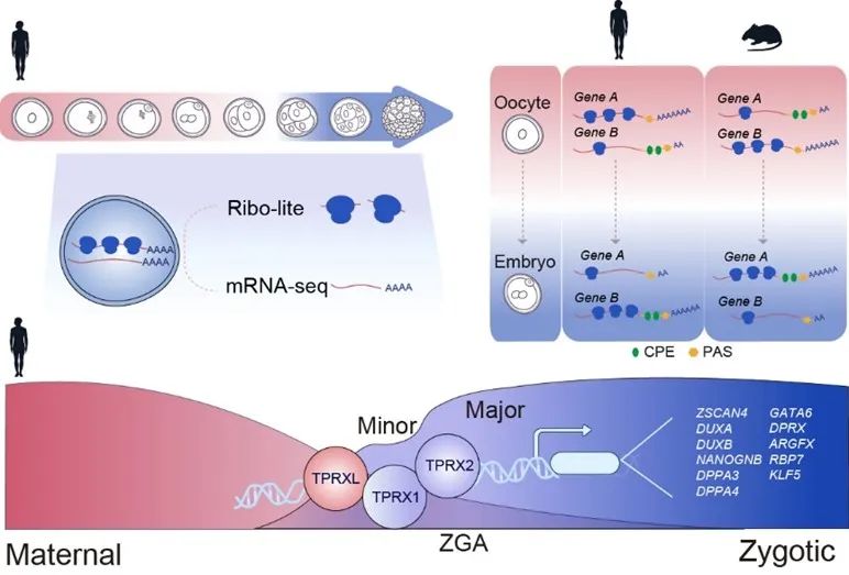 研究团队结合超灵敏翻译组测序技术(Ribo-lite)和转录组测序技术(Smart-seq2),开发出一项可以进行翻译组与转录组联合测序的新技术——Ribo-RNA-lite(简称R2-lite)。利用此技术,研究团队发现,一组同源域(Homeobox)转录因子在人类合子基因组激活阶段附近呈现高翻译活性,这些转录因子包括母源因子TPRXL以及在初级ZGA时期开始表达的TPRX1和 TPRX2。它们潜在的DNA结合基序在ZGA基因的远端开放染色质区域(即可能的增强子)上高度富集。因此,这些转录因子可能就是ZGA过程的关键调控因子。也就是说,这项研究揭示了人-鼠早期胚胎翻译组动态变化的差异性和保守性,并且鉴定出了人类ZGA过程的关键调控因子TPRXL、TPRX1和 TPRX2。