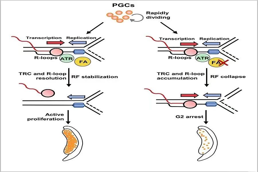 该研究首次发现PGC中存在高频率转录-复制冲突(transcription-replication conflicts,TRC),TRC能够激活范可尼贫血(Fanconi anemia,FA)通路,通过稳定复制叉和解除R-loop有效应对TRC,从而维持PGC的快速增殖。FA通路失活则导致TRC解除障碍和R-loop聚集,DNA损伤增加,进而激活p53通路引起PGC增殖障碍,最终引起不孕不育。该研究为FA患者的生育障碍提供了新的机制解释,同时也为生殖细胞基因组稳定性维持机制研究提供了新的方向。参考资料: