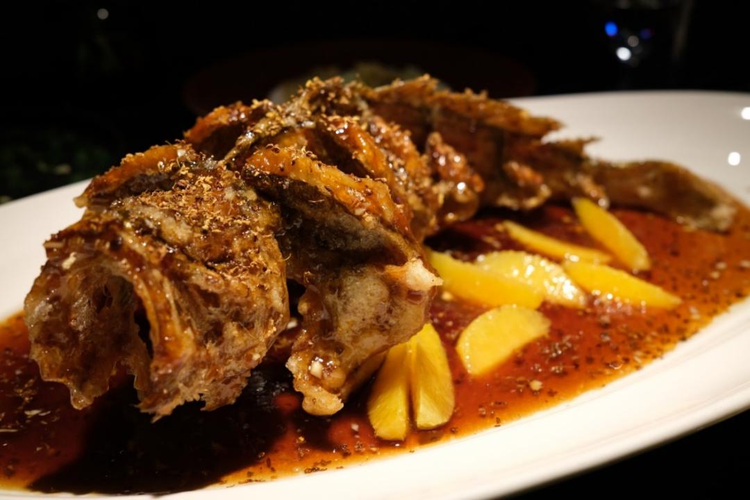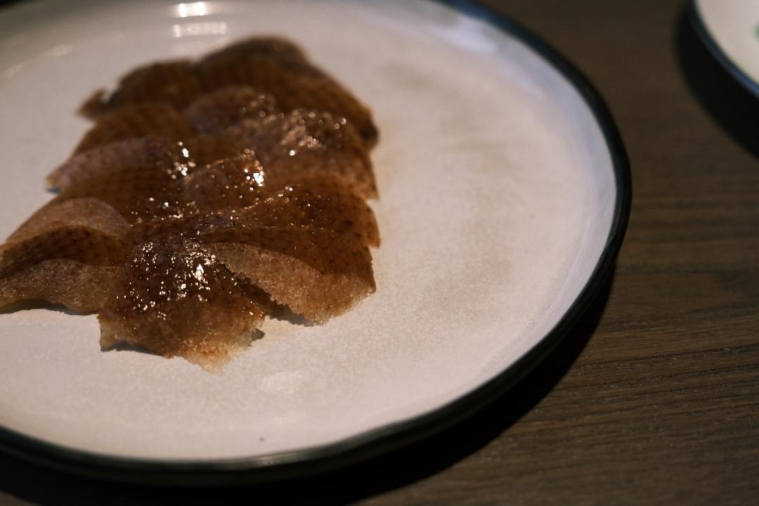 火焰这事儿最初见还是儿时看俄罗斯马戏团,后来有见过火焰冰激凌、火焰鱼头煲。这次是涅槃重生的烤鸭,仪式感足吗?足!因为男人不管多大,都爱火。至于是否能增加烤鸭的香气或者酥皮能否更焦脆,这件事,我可能吃的快,忘了感受。但是毕竟是黑珍珠,我愿意相信无论物理还是化学是有改变的。