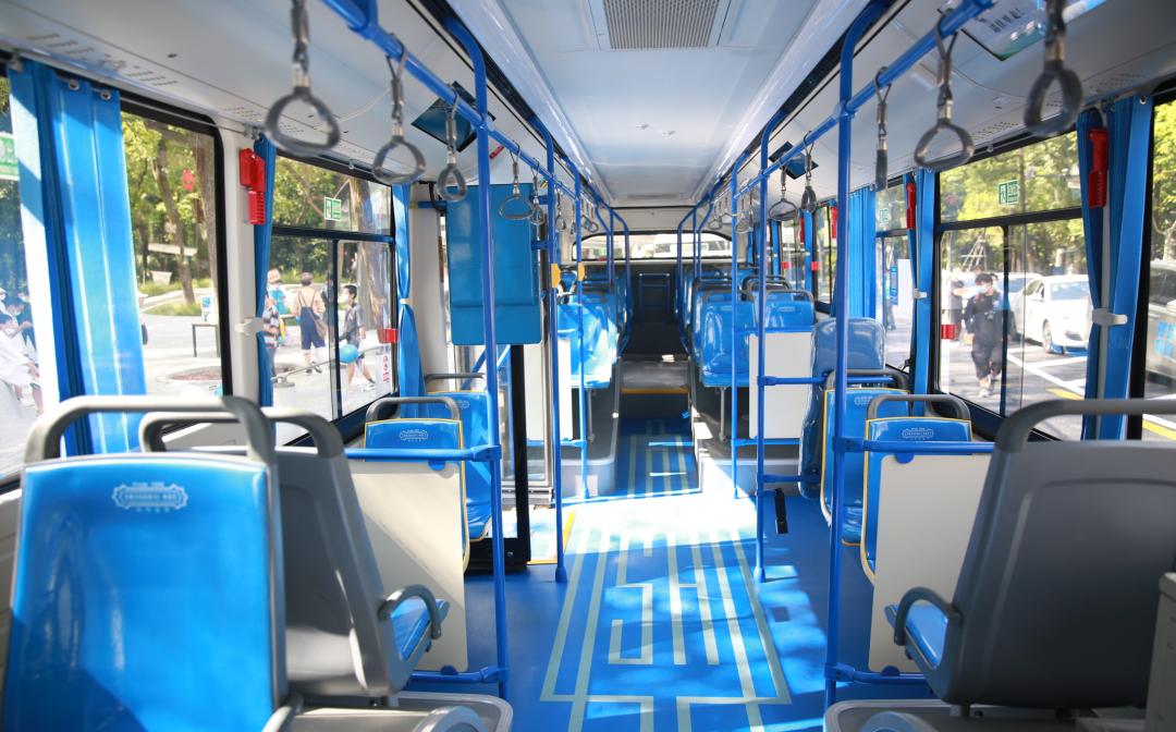 车厢内饰则选用“怀旧的时光追忆主题”,整体色调以海派蓝色为主,呼应外车身涂装总色调,突出典雅、精致的装饰艺术风格,体现海派文化的氛围。同时,通过车内LED氛围灯带表现出夜上海的繁华和科技氛围,同时,车辆保留了上海市民熟悉的“小辫子”。20路新车型虽然外型“复古”,但“内芯”却科技感十足,处处体现着人文关怀。