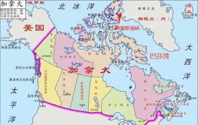 ▲加拿大(换个)和哈德逊湾公司、西北公司和不列颠哥伦比亚省之后,面积扩大但加拿大和格陵兰岛之间的纳雷斯海峡一带的地理条件恶劣,人们对这里的认知较少。