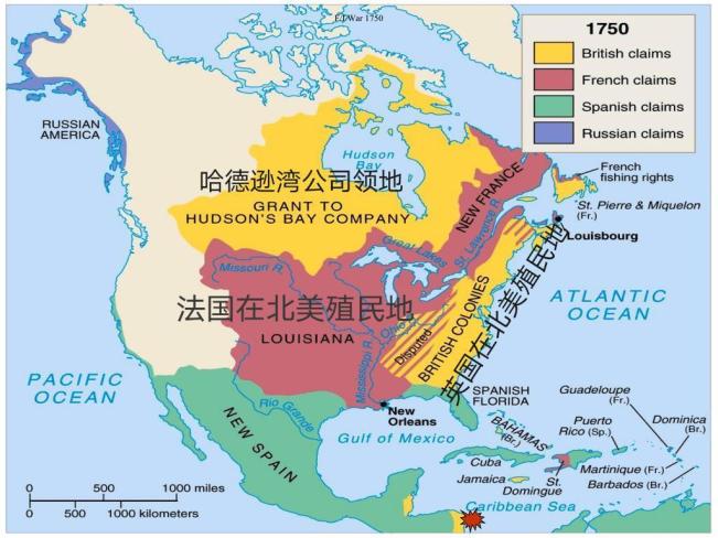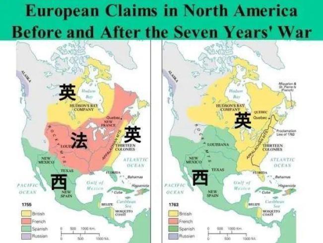 ▲英法瓜分北美洲1756年-1763年,英国通过七年战争战胜法国,夺得了法国在北美的殖民地。