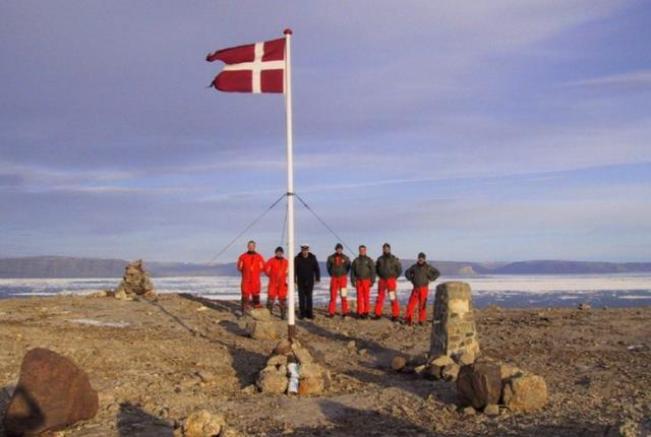 ▲加拿大登陆岛屿1984年,时任丹麦格陵兰部的部长登陆汉斯岛,拔掉了加拿大国旗,插上丹麦的国旗宣誓主权。又在此地埋下了丹麦产的杜松子酒宣誓主权。并在其写下了标语:“欢迎来到丹麦的岛屿。”