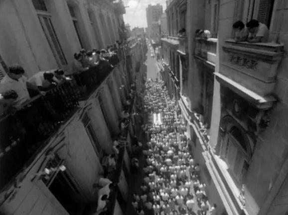 对自我的再认识的第二点指向的是古巴人民自身的追求与期盼。回到当时的时代背景上看,冷战初期,以美苏为首的两大阵营正处于互相对峙、剑拔弩张的状态。这部电影拍摄于1962年,这年10月,正是在古巴这块土地上爆发了古巴导弹危机,虽然危机仅仅持续了13天,但人类却空前接近毁灭的边缘。当时归属于共产主义的古巴与来自苏联的导演卡拉托佐夫发生的化学反应最终生成了这样一部革命史诗。但在当时的特殊背景下,这其中难免夹杂着意识形态的对立和对革命情绪的煽动,使得古巴人民自身最真实的追求与期待似有埋没。事实上,古巴人民想要的不是眼前受限于意识形态的革命,而是超越意识形态的自由、独立、民主、稳定与幸福。不过想要实现这些设想,唯有依靠毫不妥协的革命。古巴人民,这群怀揣着理想主义的实干家,努力地使自己融入到了民族解放运动的大潮之中。