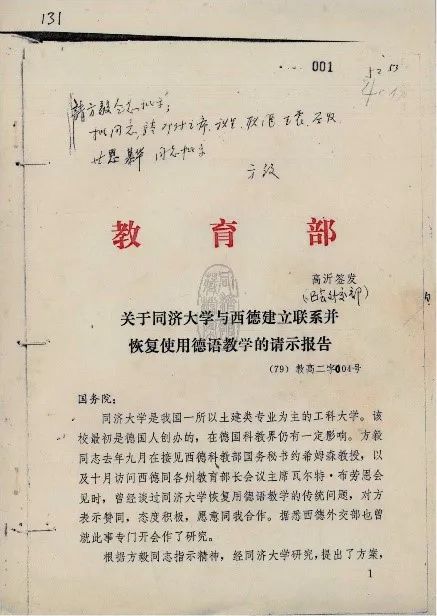 图:教育部向国务院提交的《关于同济大学与西德建立联系并恢复使用德语教学的请示报告》