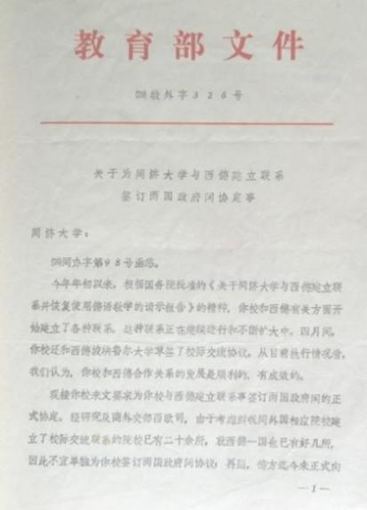 1979年1月,邓小平、方毅、余秋里、耿飚、王震、谷牧、康世恩、陈慕华等8位副总理批示,同意1月26日教育部给国务院的《关于同济大学与西德建立联系并恢复使用德语教学的报告》。《报告》指出:“同济大学拟参照西德大学的系科设置,并结合我国实际情况,有步骤地增设新专业,特别是理、工科中的新技术和德语专业,如应用数学、应用物理、应用化学、工程力学、计算机技术、热质传递与流体力学、信息专业等,逐步将同济大学办成具有特色的多科性理工科大学。”