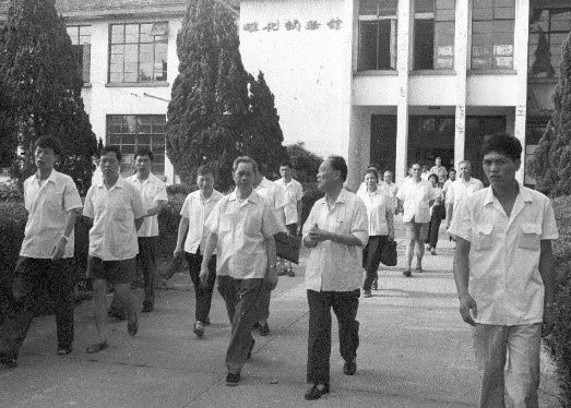 图:1979年7月,方毅副总理来校视察,指示学校进一步推进“两个转变”根据“两个转变”的总体目标,1979年,学校在9个专业恢复德语为第一外语,当年入学的500多名新生在第一学年将德语学习为主要教学内容;此外,学校还从1977、1978两年入学的学生中抽调200人增加1年德语学习。1980年,学校又将第一外语为德语的专业扩大至全校近一半专业。1979年,学校成立外语系,内设了德语教研室、德文资料编译室,并在全校开展德语广播教学;此后,外语系开始招收科技德语专业本科生和硕士研究生,并开办科技德语进修班。