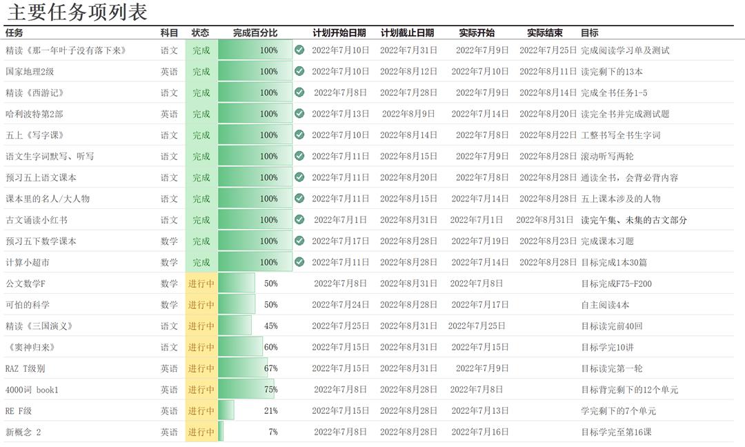 暑假我们的主要任务项平均完成率78%,基本符合预期。以往的每个假期都没有全部完成过,这个假期也不会例外,用娃的话说,计划目标总是要订的稍微高一点嘛,完成80%就可以了。