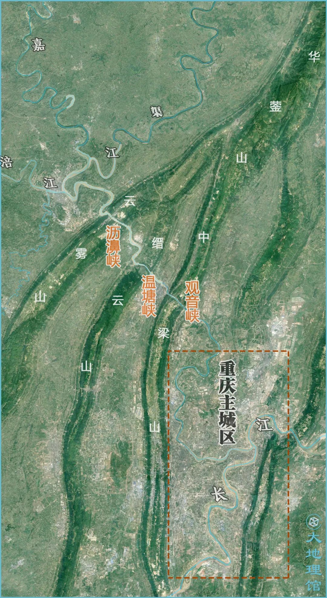 从三维地形图上看,河流“切穿”了云雾山、缙云山、中梁山等三道山脉,也分别形成了沥濞峡、温塘峡、观音峡,仿佛长江三峡的缩小版。