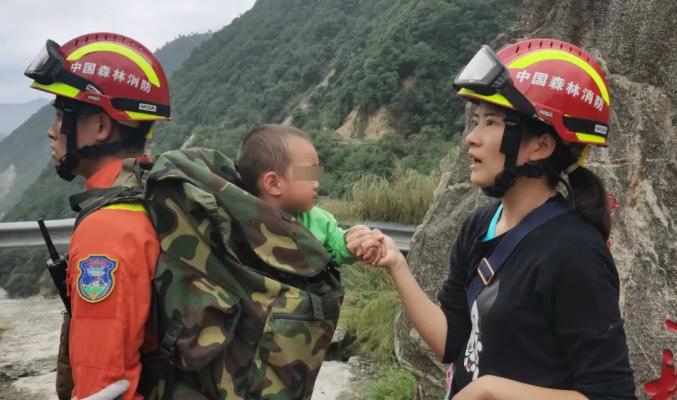 被困群众杜彦庭的儿子还未满3岁,走到塌方路段前,消防员王家伟从杜彦庭怀里,接过孩子背在了身上,给孩子戴上防护头盔。