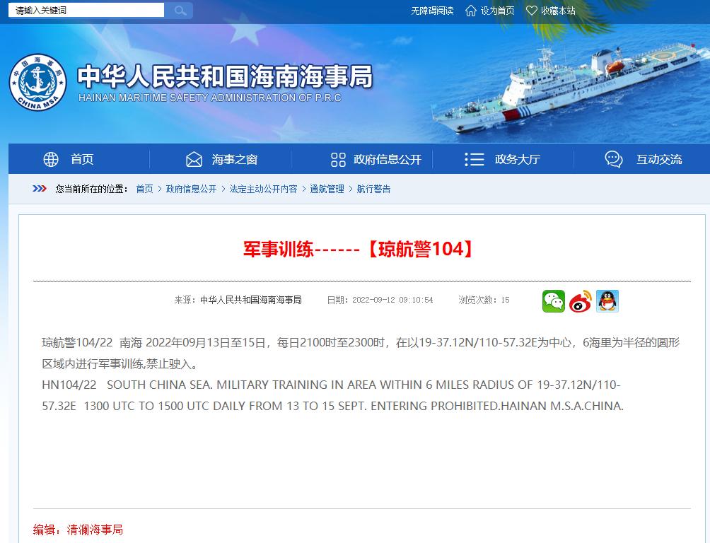 从海南海事局获悉,清澜海事局发布琼航警104/22,南海 2022年09月13日至15日,每日21时至23时,在以19-37.12N/110-57.32E为中心,6海里为半径的圆形区域内进行军事训练,禁止驶入。