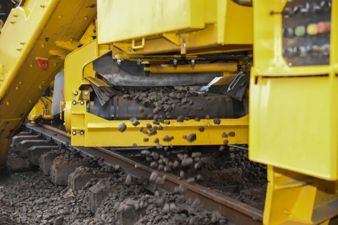 挖拢口、连接挖掘链……轨枕下的石砟在挖掘链的裹挟下,通过导槽进入清筛机进行筛分,黑色的污土、碎石砟被传送带收集到清筛车后的污砟车内,洁净的石砟通过回填装置落入道床中。