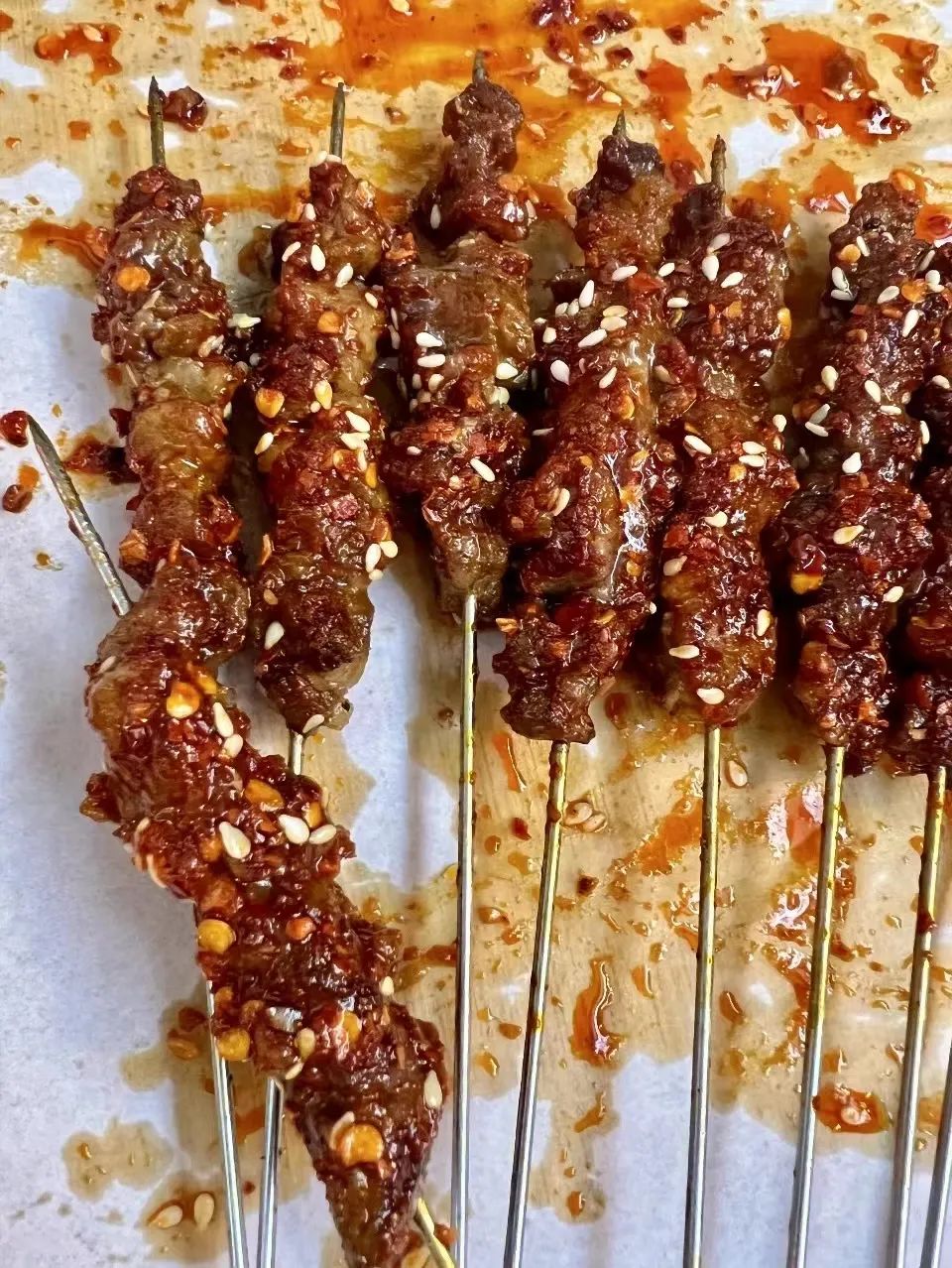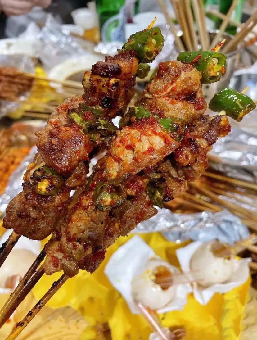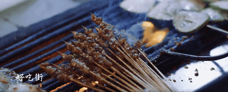 羊肉、牛肉、五花肉、鸡爪、牛筋、黄喉、板筋、牛小肠、鸡皮等一把把小串在黑夜冒烟的炉火中被烤的滋滋作响,让人不间断分泌口水。