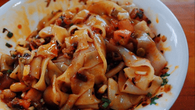与贵阳招牌的清汤牛肉粉不同,安顺的红烧牛肉粉则更多是加入辣椒和豆瓣酱与牛肉同炒再焖,铺上雪白的粉上,拌匀了再吃,香辣又过瘾。