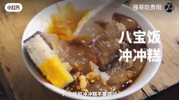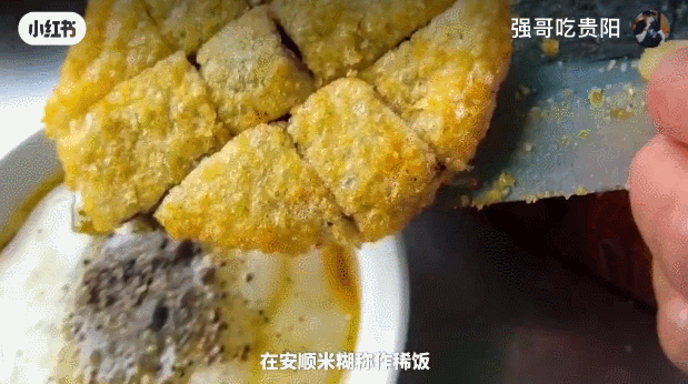小红书©️ 万万万yolo炸得金黄香脆的咸豆沙味儿的糍粑切块后,铺在下浓郁的米糊中,再淋上极具黔中特色的酥麻,和一瓢热油,味道很是奇妙。