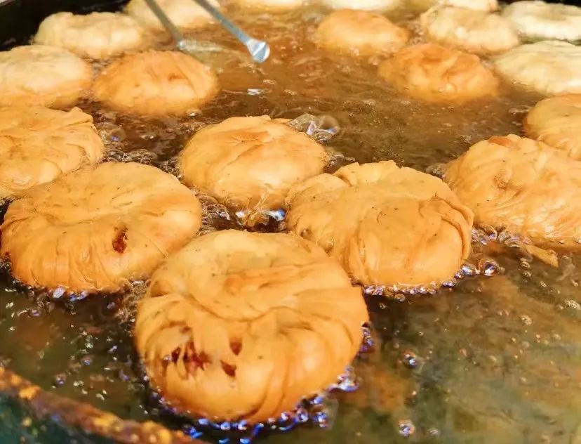 胖乎乎的肉饼整齐地铺在油锅上,个个被炸地滋滋作响,金黄酥脆,香气扑鼻。