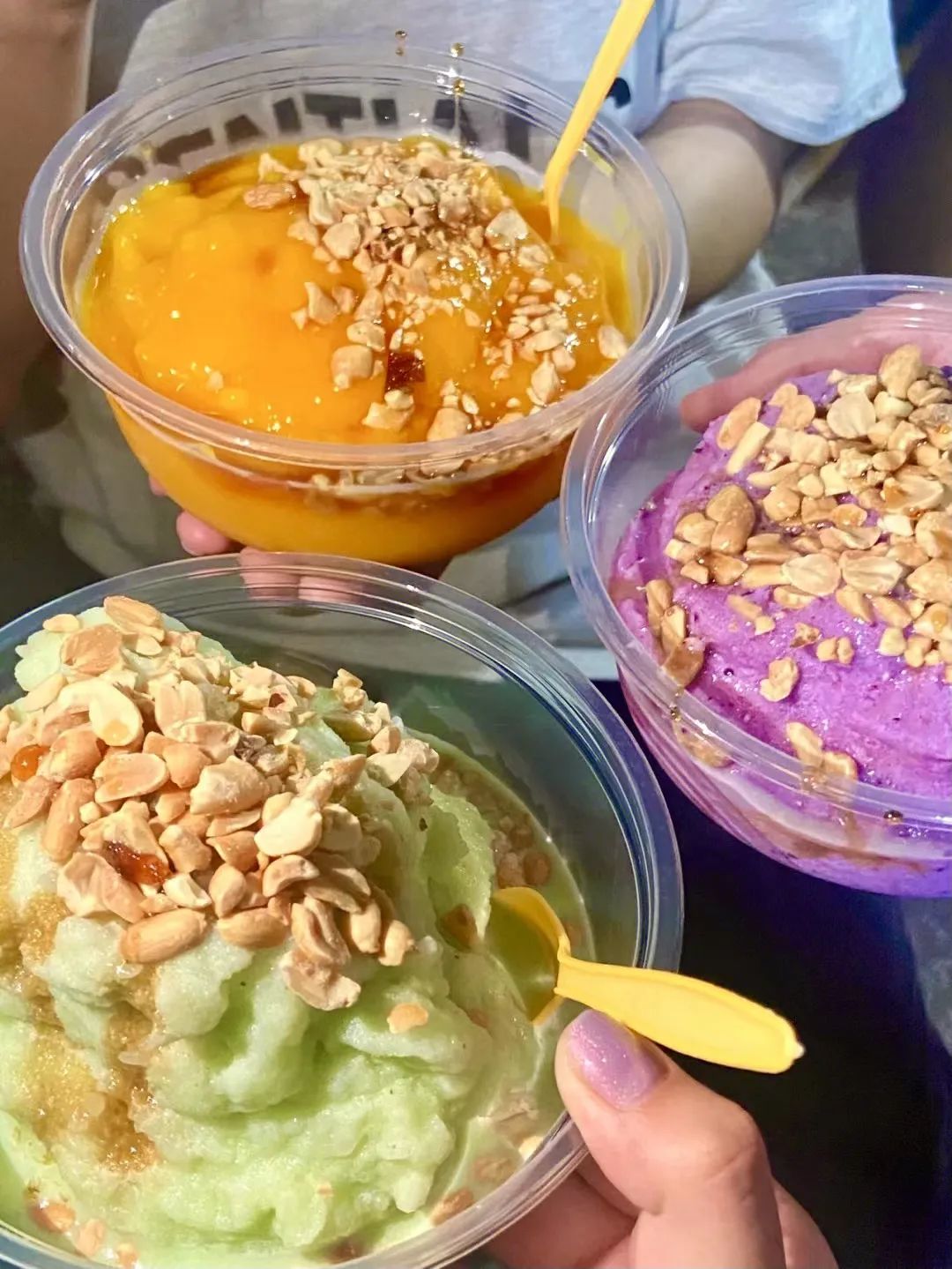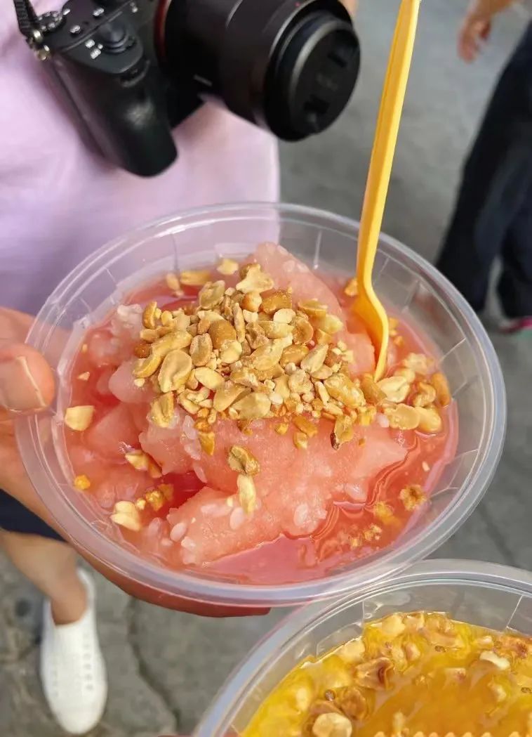 冰块、糯米和水果一起搅成冰浆,再撒上果肉、花生碎、葡萄干等,轻轻挖一勺送进口中,冰凉绵密的口感,能让舌尖瞬间坠入温柔乡。细腻轻柔甜、甜蜜无限的冰浆,每一口都不会让人失望。