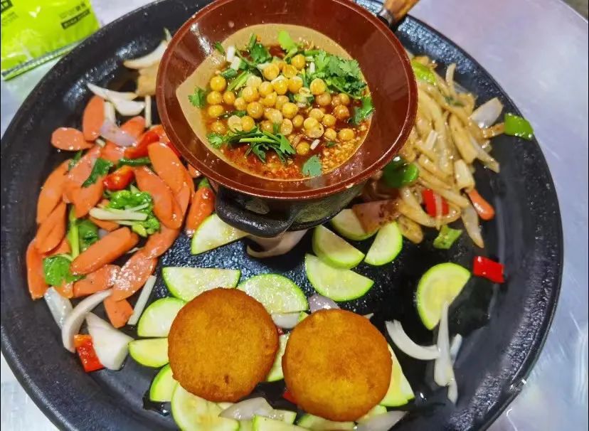 烙锅其实就是一个中间凸起的黑砂锅,将洋芋粑粑、莲藕、豆腐、火腿、牛肉、鸡皮、凉粉、鸡胗等食材一股脑放到烙锅上,焦焦脆脆,再蘸一下辣椒水,口感简直了。
