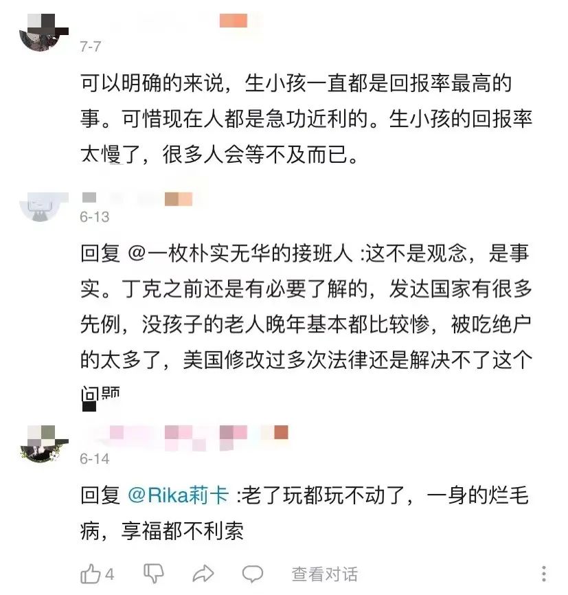 多么清醒而负责的发言,可尽管如此还是引来评论区不少人苦口婆心的教育。说得最多的还是一个意思:不生孩子老了怎么办?