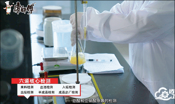 三道人工清洗、四道设备清洗(画面来自人民网“透明工厂”直播)在老坛酸菜二次发酵过程中,大叶芥菜与盐卤水相遇,鲜味开始蔓延,老坛工艺密封发酵,更能保障发酵后的酸爽风味,且产生的乳酸菌本身就是“天然防腐剂”,也是这场时间魔法背后的秘密。此外,在此期间品控团队还会通过科学的数字指标对所含物质进行分析,保证产品酸度也必须恰到好处。待再次开坛,老坛酸菜散发着令人味蕾跳动的气息,品控团队严把“出坛”检测关,再由巴氏杀菌生产线冷却、烘干,经过一系列异物检测、定压,一袋小小的酸菜包就此诞生。