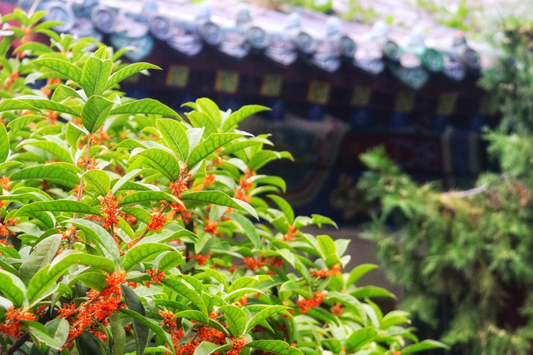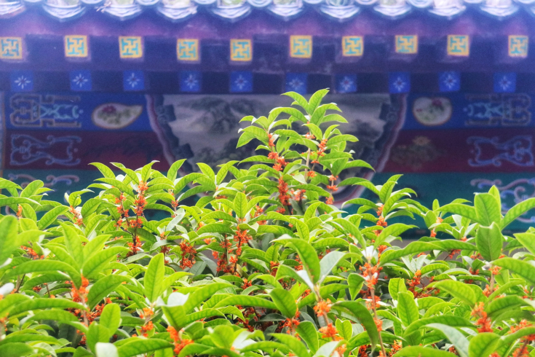 岱庙西花园内,桂花与古朴的建筑相映生辉,密密麻麻的花苞布满了枝丫,小小的花朵掩映在茂密翠绿的枝叶中,清丽出尘,婉约淡雅。