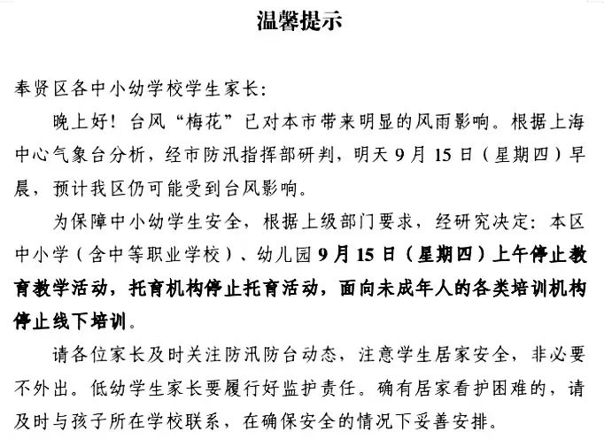 受台风“梅花”影响,上海奉贤各中小幼学校9月15日停课半天,上海松江各中小幼学校推迟2小时到校。