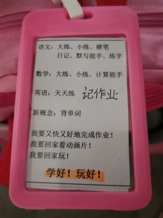 这个两面透明,一面是课程表和每日必收的东西,包括红领巾,面包,水杯。另一面是她每天的常规作业,包括《默写能手》,《计算能手》,《大练小练》等。她每天做完作业,自己对照着小牌子收拾次日的书本。我一般只在开学和国庆节后稍微提醒几天,然后就完全不管了。因为每次开学,其实都是习惯的重新捡起,所以我会稍微提醒下。后来她直接把很多东西,放在学校后面的收纳盒里,这样就避免忘记了。