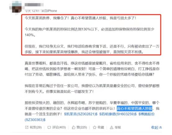 该网友描述称“今天我的账户凯莱英担保比例达到130%以下,必须追加担保物保持担保比例至少140%。”文末该股民强调道,“真心不希望普通人炒股,我就是一个活生生的例子!”