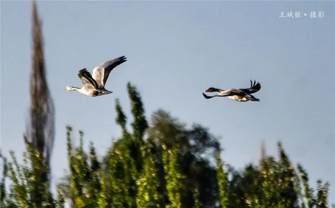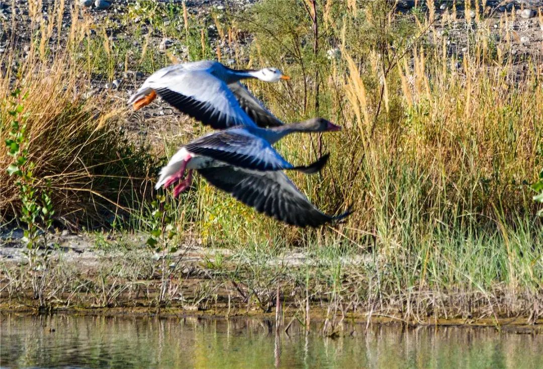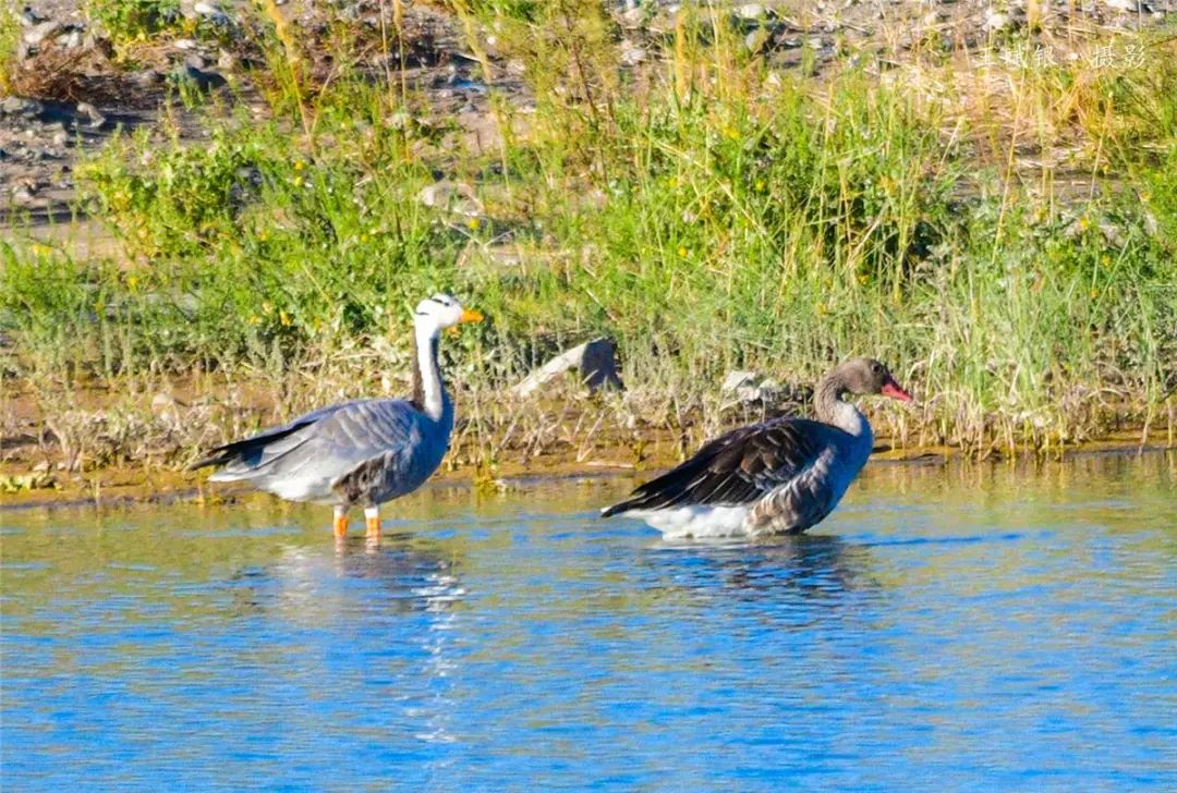 党河水域斑头雁、红嘴雁一起游弋、觅食。