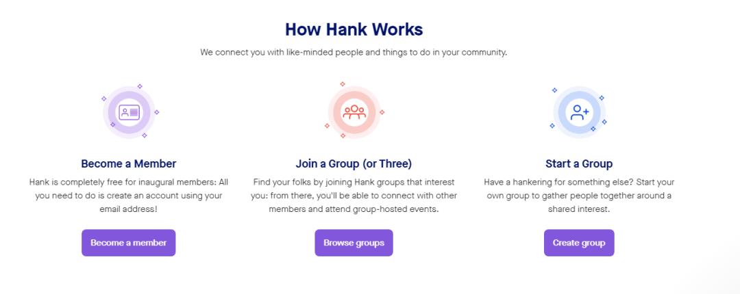 Hank的主要业务是兴趣团体与线下活动。用户可以免费成为Hank的会员,唯一限制条件是必须为55岁及以上。成为会员以后,用户可以随意加入一个团体或直接参与活动,如果没有自己感兴趣的团体和活动,用户可以自主创建。