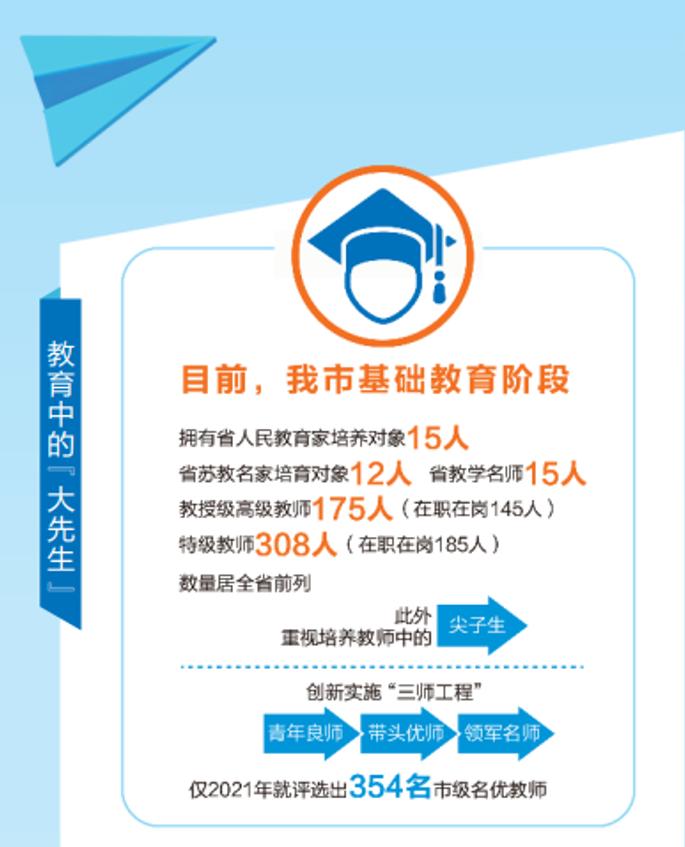 人才强教战略深入实施,高校拥有“百千万”领军人才、国家级教学名师等国家高层次人才276人,中小学拥有国家、省、市各级名师1500余人。功以才成,业由才广。