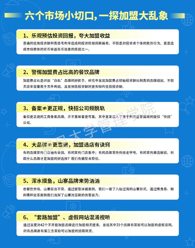 通过对门店在20家以上,相对头部的1000多个餐饮品牌、遍布全国的46万余家门店的定量研究,研究团队发现在餐饮行业“特许加盟”过程中,存在着虚报收益、占用保证金、假冒名牌、兜售信息等种种乱象,有些甚至是故意损害加盟者利益的不当经营行为。