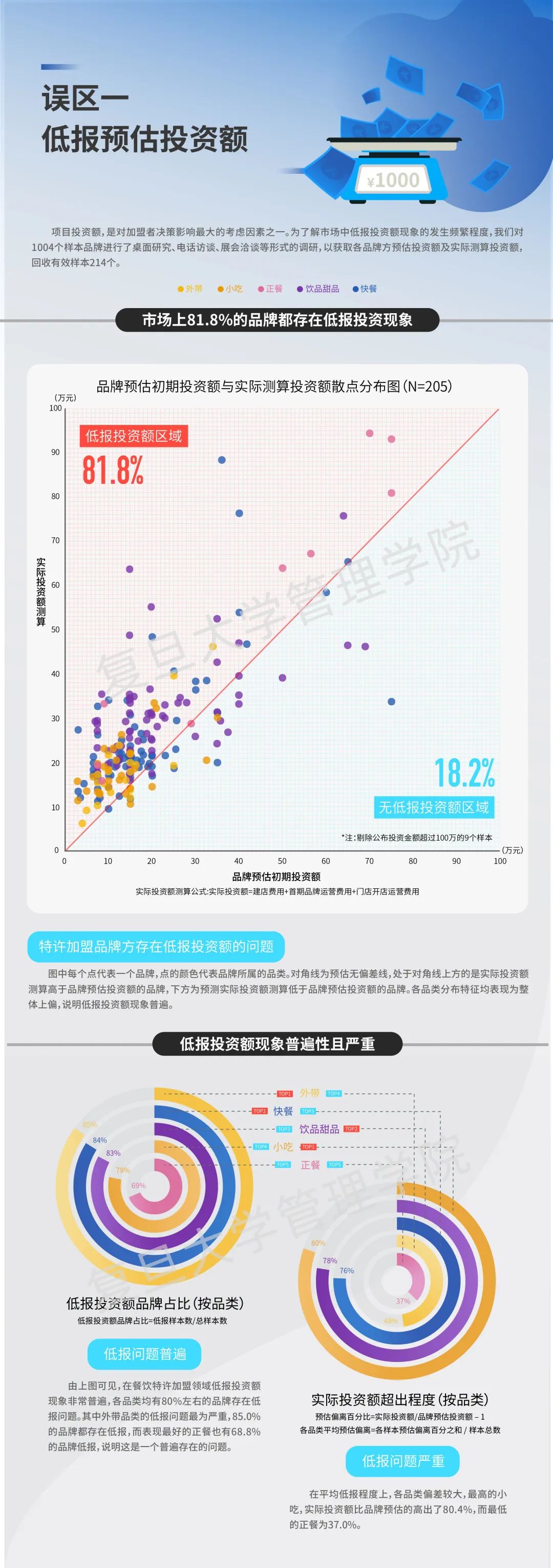 通过实地访谈、调研得知,市场上81.8%的品牌都存在低报投资额现象,品牌方低报初期投资额的具体方式包括降低采购档次预估、漏算必要科目等。