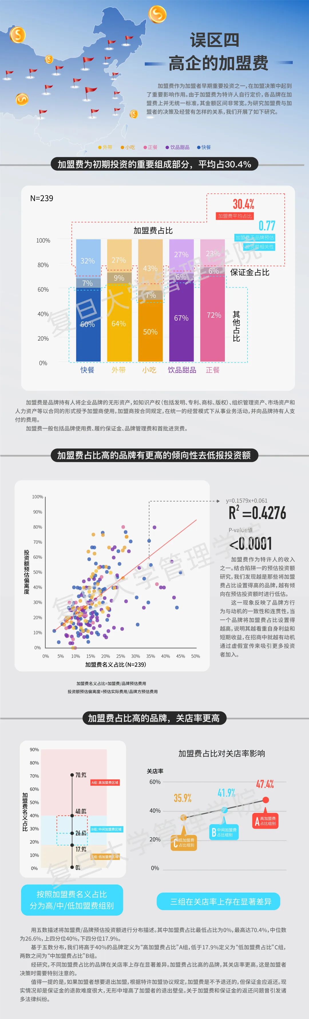 研究显示,加盟费为初期投资的重要组成部分,平均占30.4%;加盟费占比高的品牌有更高的倾向性去低报投资额,关店率也更高。