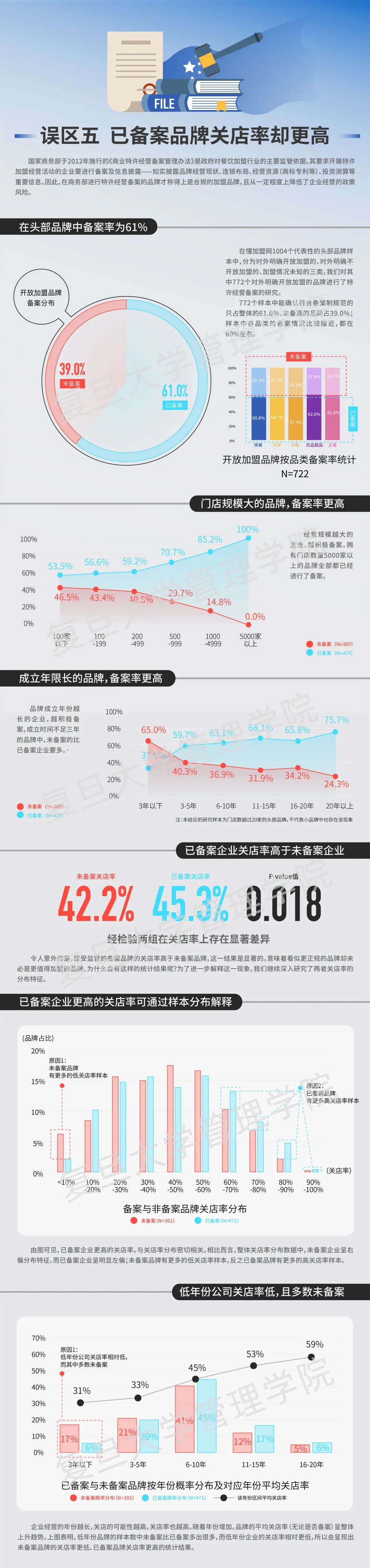 研究发现,品牌的备案率与门店规模、品牌成立年限呈正相关关系。企业经营的年份越长,关店的可能性越高,关店率也越高。随着年份增加,品牌的平均关店率(无论是否备案)呈整体上升趋势。