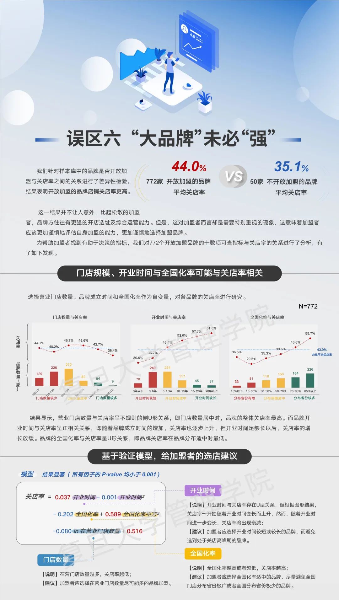 误区六:“大品牌”未必“强”长久经营一个餐饮品牌,是开放加盟好呢,还是不开放加盟好?对此,研究团队针对样本库中的品牌是否开放加盟与关店率之间的关系进行了差异性检验,结果表明,开放加盟的品牌店铺关店率更高。针对潜在加盟者,在选择品牌时,往往容易对那些门店数量多、开业时间长、省份分布广的品牌格外青睐,但实际上,那样的品牌未见得是最安全的。