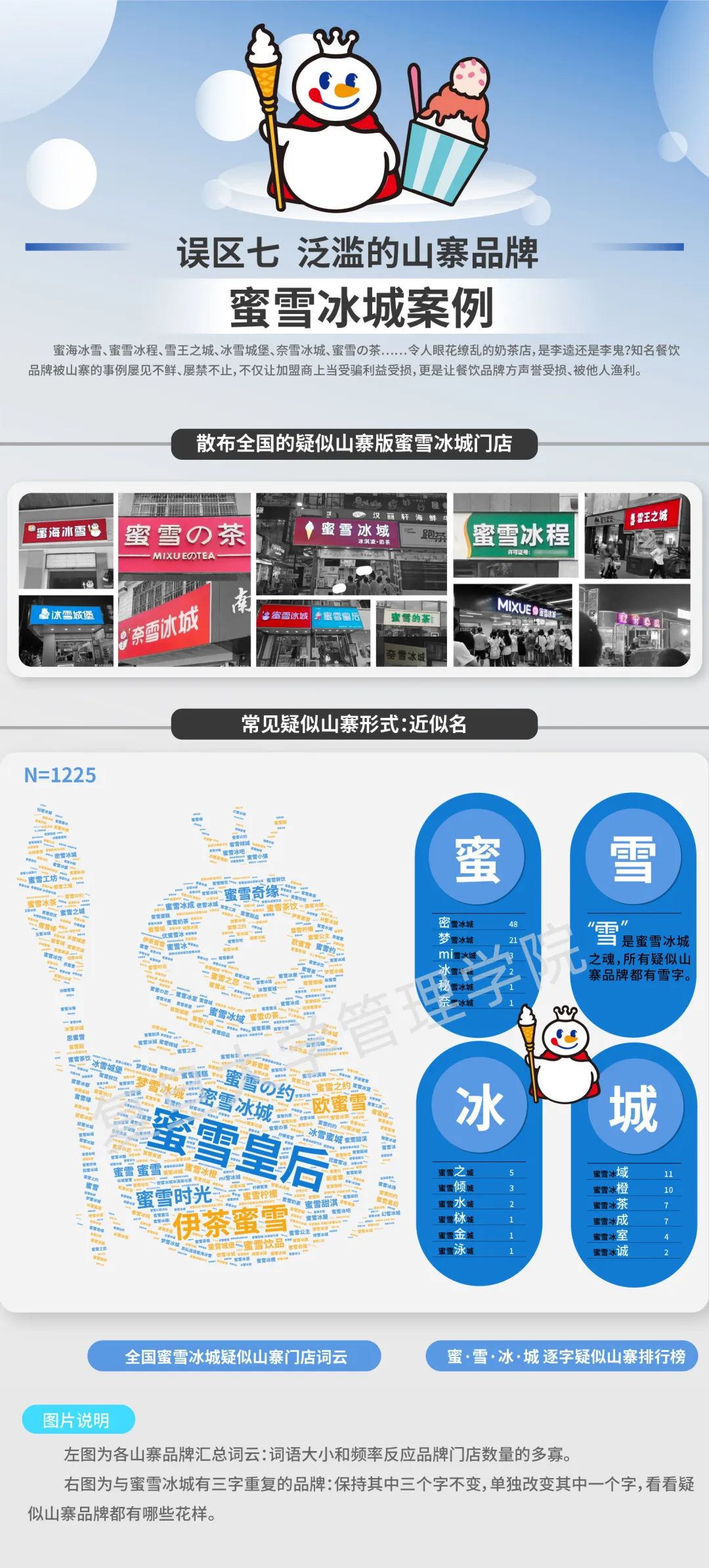 误区七:泛滥的山寨品牌蜜海冰雪、蜜雪冰程、雪王之城、冰雪城堡、奈雪冰城、蜜雪の茶……令人眼花缭乱的奶茶店,是李逵还是李鬼?这些名字中似乎都带有“雪”、“冰”和“城”的奶茶品牌,几乎都是在蹭正品“蜜雪冰城”的品牌热度和流量。