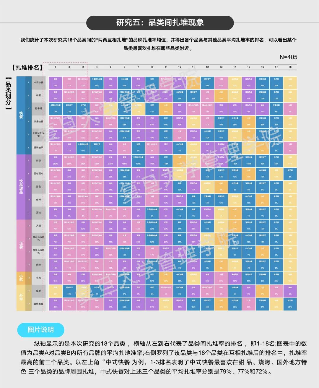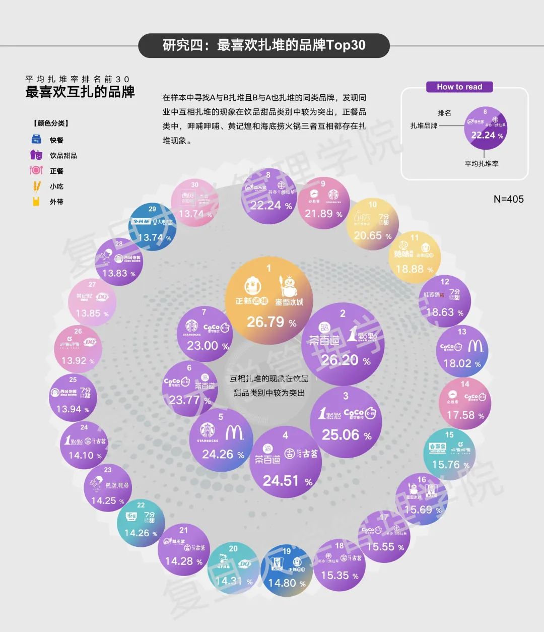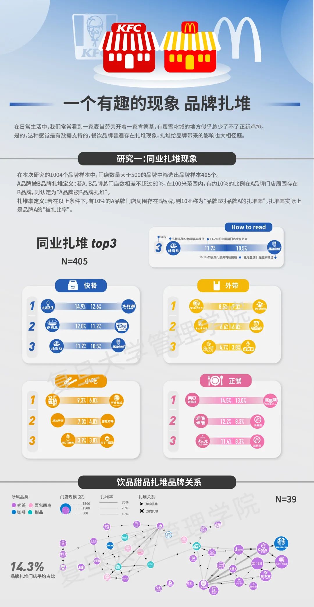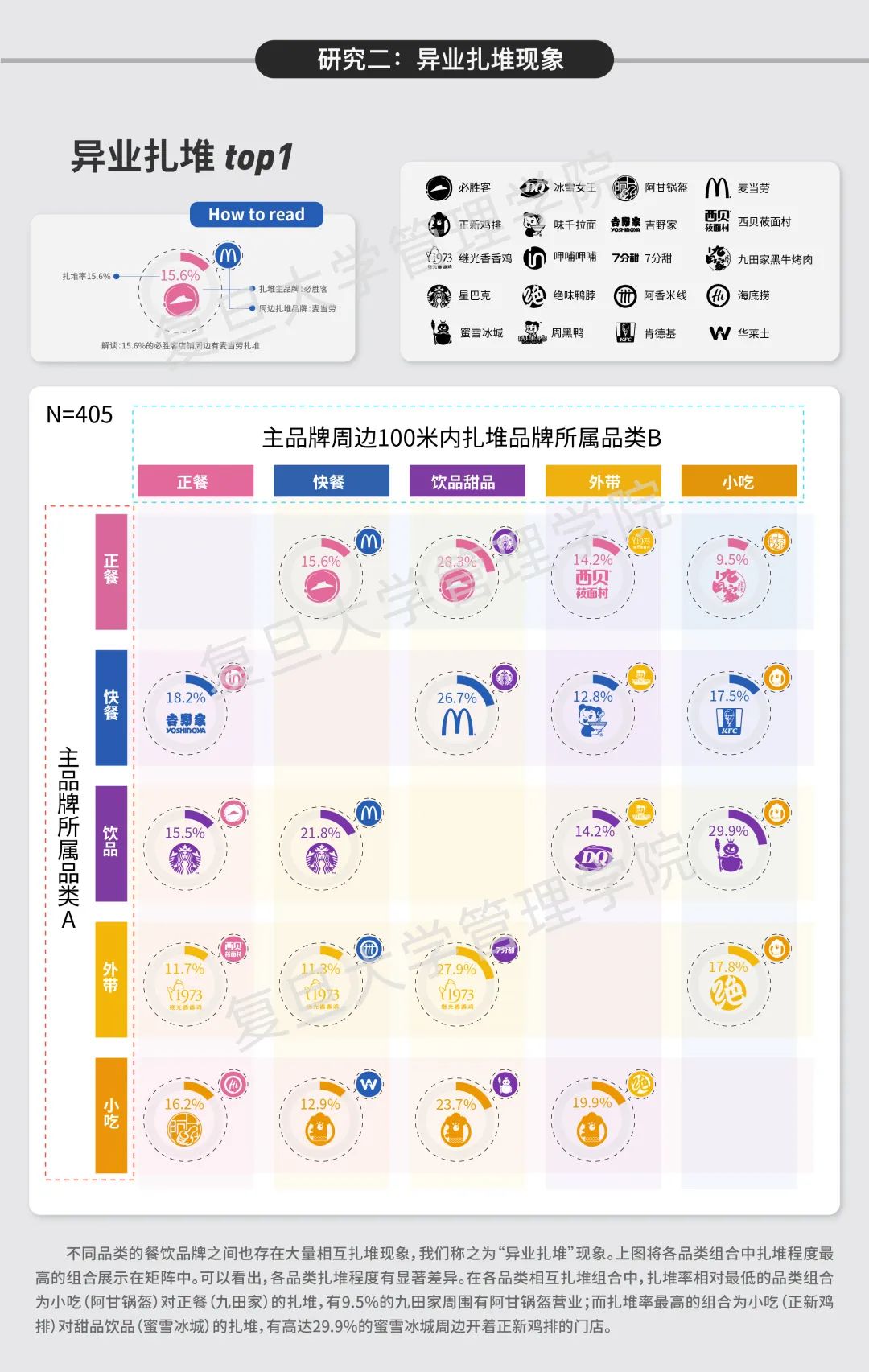 “是的,这种感觉是有数据支持的,餐饮品牌普遍存在扎堆现象,扎堆给品牌带来的影响也大相径庭。”研究团队在本次研究的1004个品牌样本里门店数量大于500的品牌中筛选出品牌样本405 个,他们发现了哪些有趣的现象?