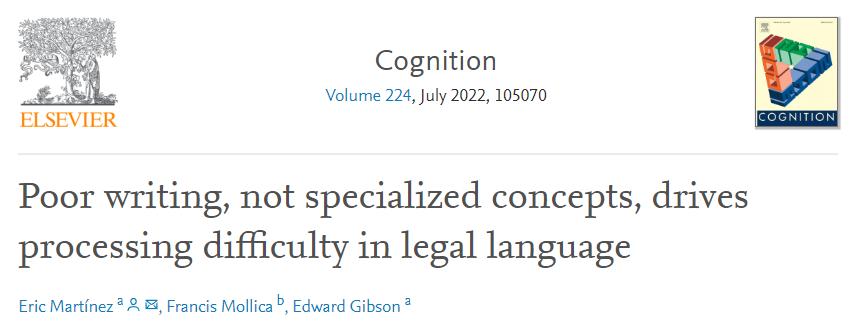 [1]Martínez, E., Mollica, F., & Gibson, E. (2022). Poor writing, not specialized concepts, drives processing difficulty in legal language. Cognition, 224, 105070.