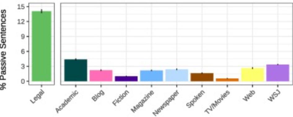 不同文章里被动语态句子的百分比,绿条是法律文书,往右依此是论文、博客、小说、杂志、报纸、演讲、电视电影、网站与华盛顿邮报在语言学大师史蒂芬·平克的《风格感觉》一书中,专门列出了一个小节来讲,误用被动语态会让文章大大变坏[2]。