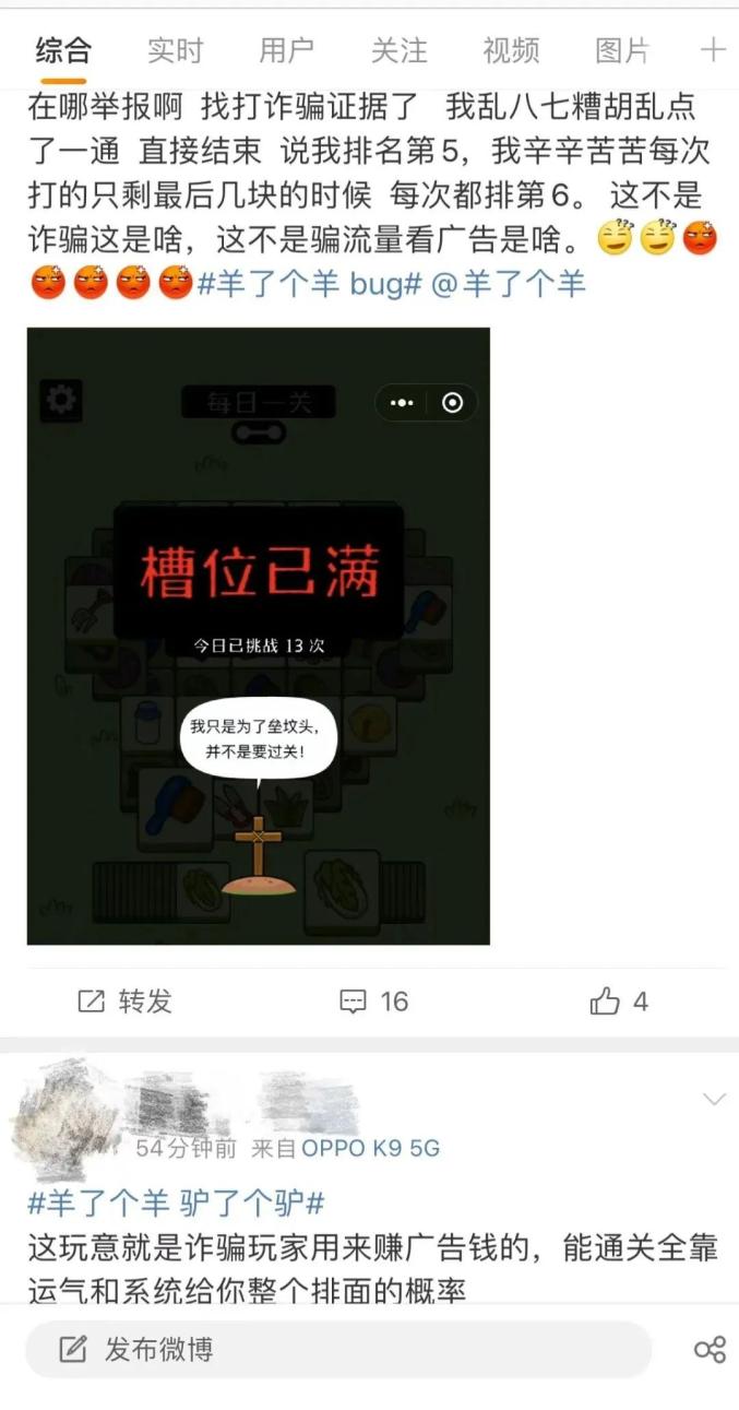 游戏总共两关,第一关相当于教学关,第二关故意设置成很难通关,从网友的截图可看出,最后剩余的卡牌根本不能匹配。网友发现,最后过不去时,游戏方会诱导点击广告或分享好友进行复活。这种方式虽然不是直接诈骗玩家的钱财(没有让玩家充值),但这种骗流量,吸引大家来玩,自己赚足广告费的行为,属于诈骗吗?或者是定性为其他行为?有没有办法进行约束或处罚?