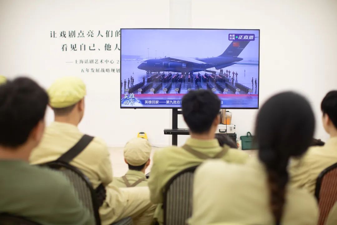 9月16日,大型话剧《英雄儿女》剧组一同观看第九批在韩志愿军烈士遗骸交接仪式直播回放。